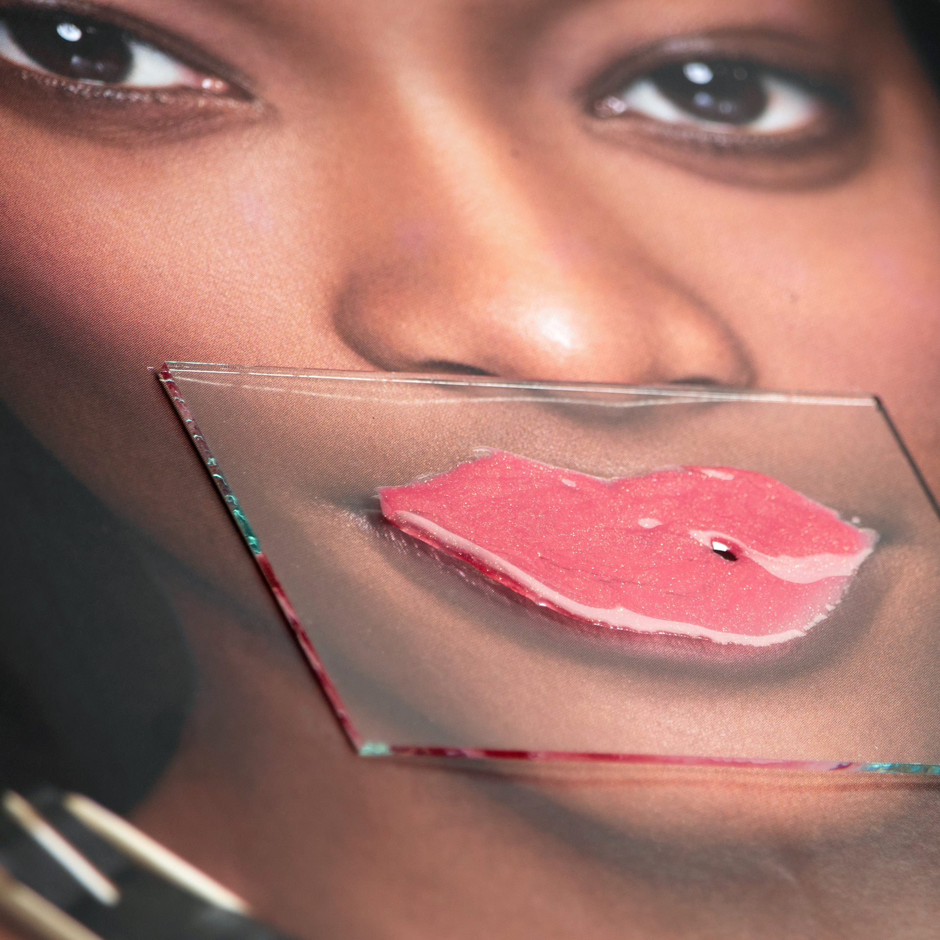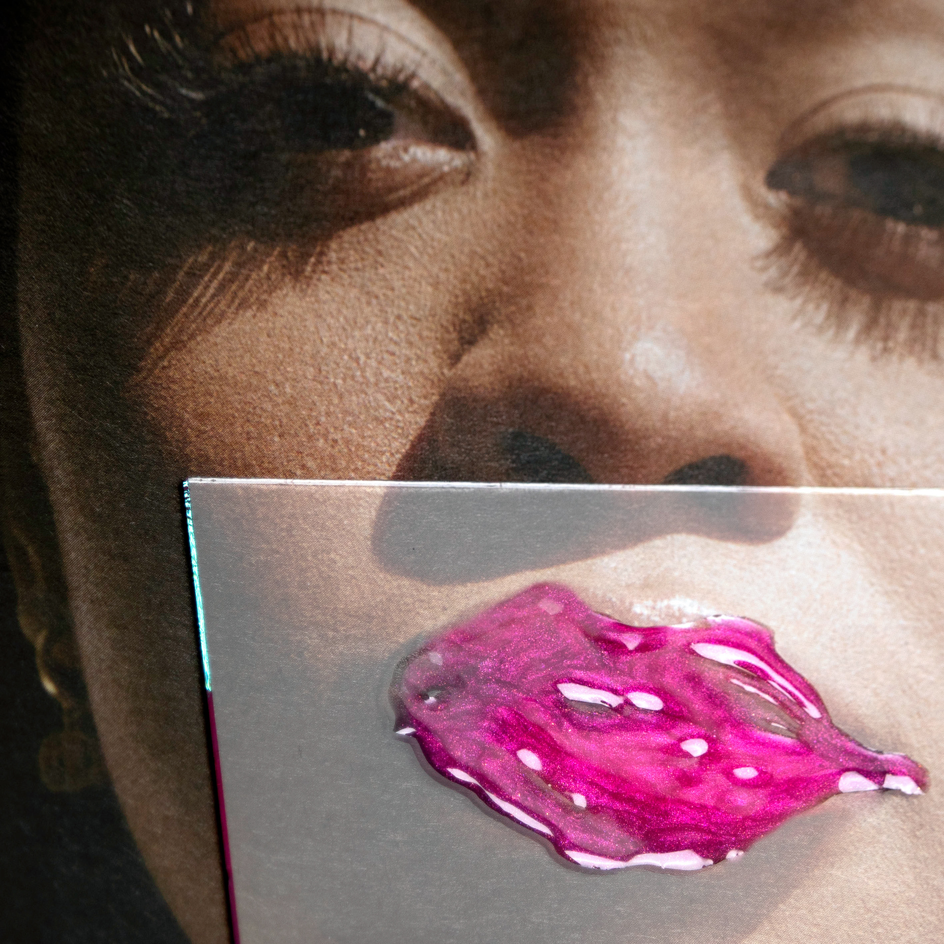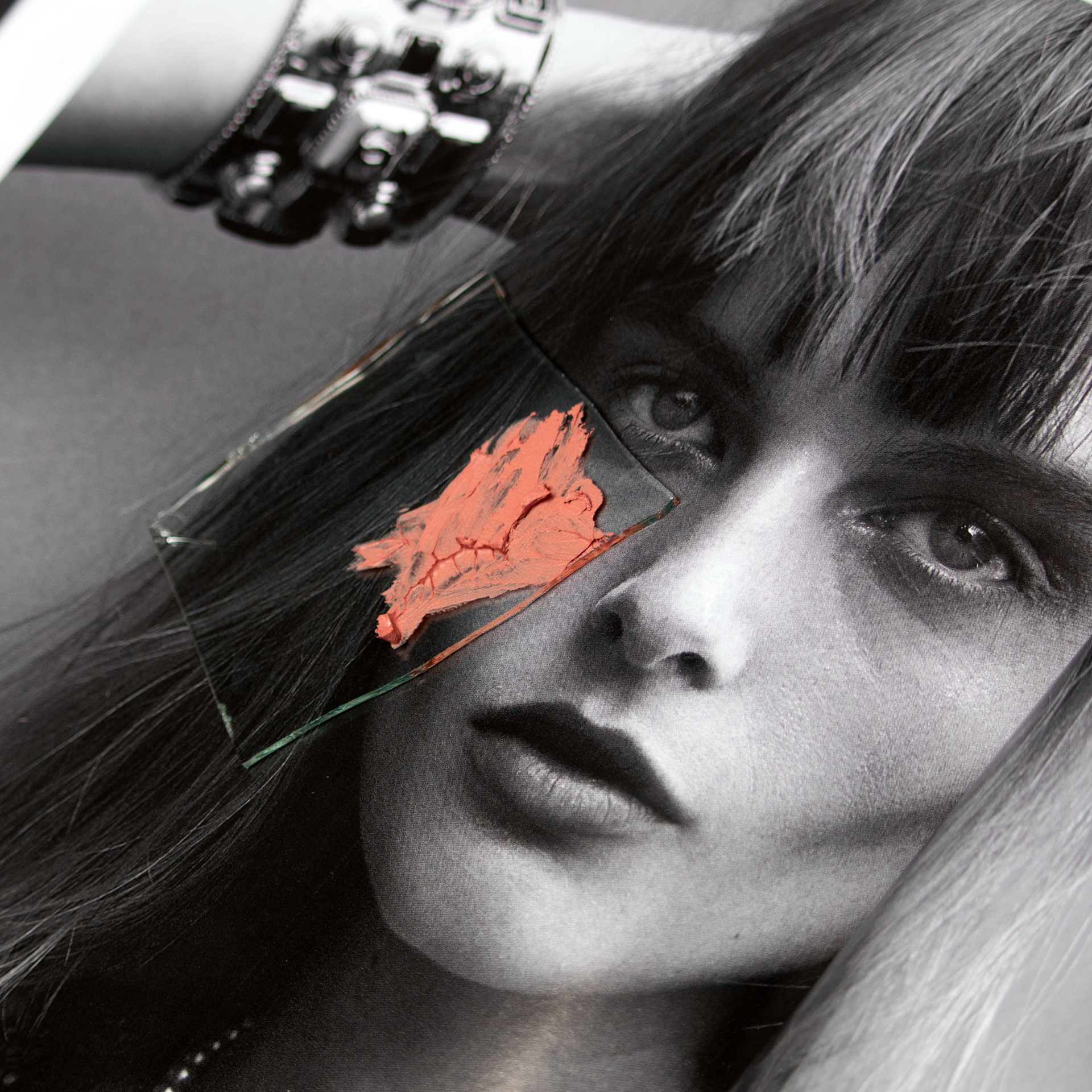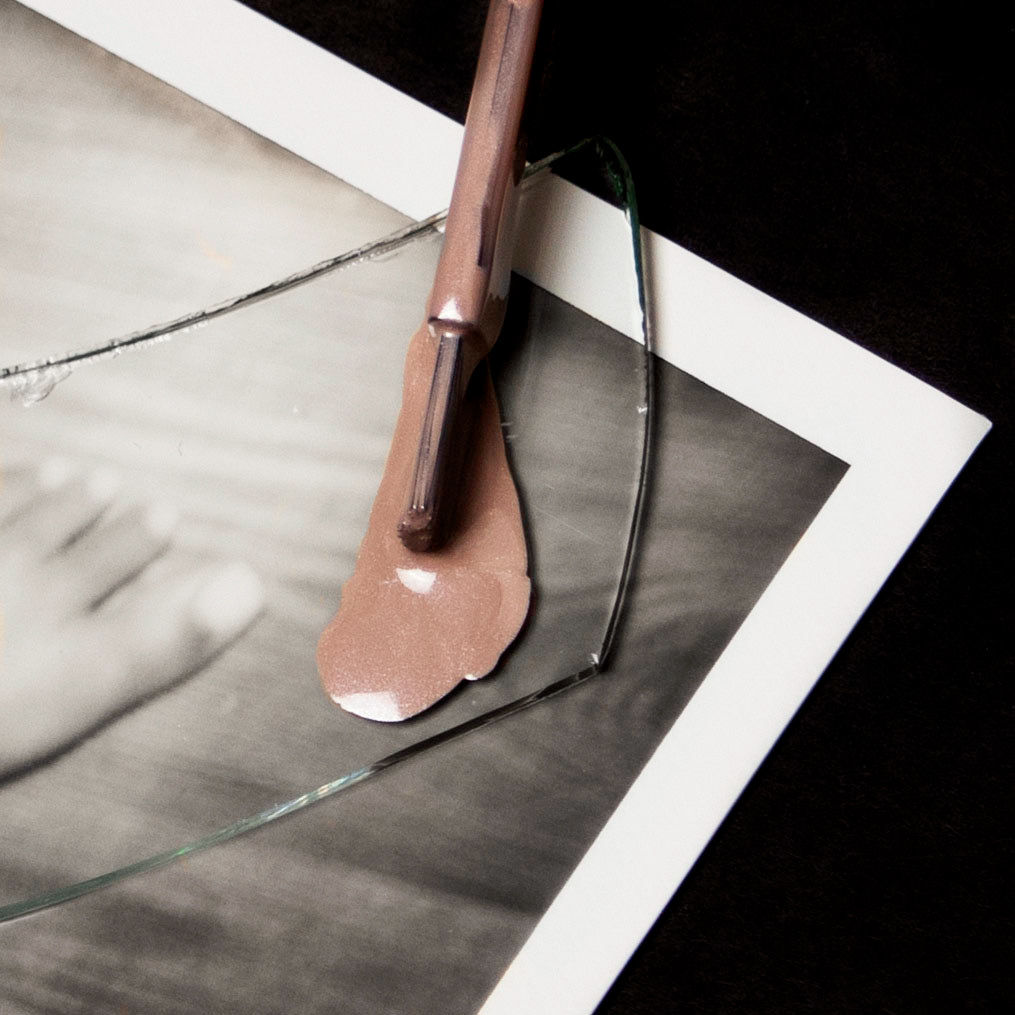 , I have been utilizing Polaroid film, print magazines, glass (shards and sheet), and cosmetic materials.